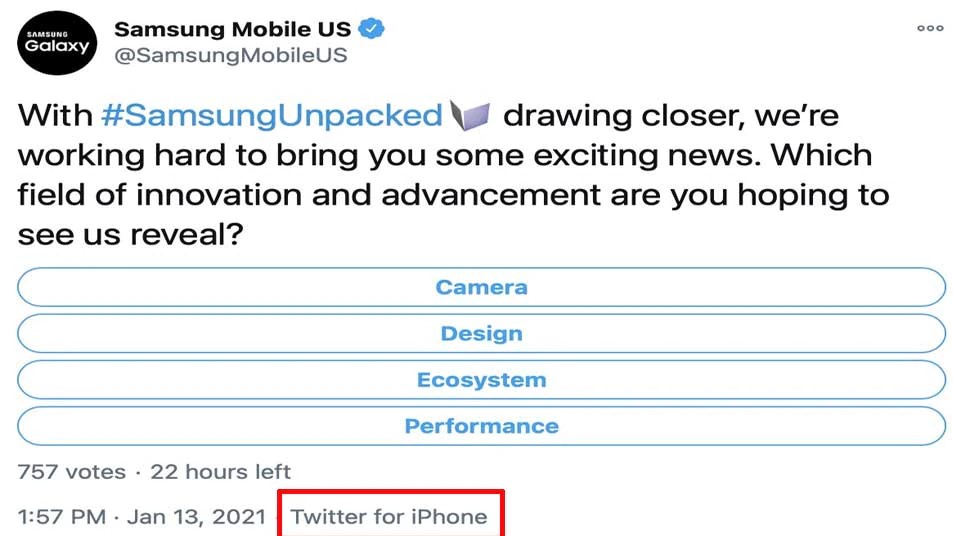 सैमसंग मोबाइल यूएस (Samsung Mobile US) के आधिकारिक हैंडल से आगामी स्मार्टफोन गैलेक्सी एस21 को लेकर एक पोल शेयर किया गया, जो आईफोन से ट्वीट किया गया था।