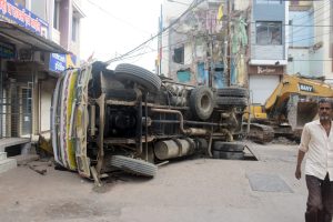 जीवाजीगंज थाना पुलिस ने बताया कि घटना आज सुबह साढ़े 6 बजे के करीब की बताई जा रही है। बालू रेती से भरा ट्रक केडी गेट चौराहे से गुजर रहा था। इस दौरान ट्रक का पहिया नाले के चेम्बर में फँस गया और ट्रक वहीं पलटी खा गया। ट्रक पलटने की आवाज सुनकर वहाँ अफरा-तफरी मच गई। जल्दी सुबह उक्त हादसा हुआ, उस समय चौराहे पर काफी कम लोग थे जिससे गंभीर हादसा होते-होते बच गया।