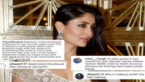 हालांकि, साड़ी को सेक्सी टच देते हुए ड्रेप करना ही लोगों को अखर गया। उन्होंने करीना के कपड़ों की तारीफ की लेकिन ये जाहिर करने में भी देर नहीं लगाई कि उन्हें इसे पहनने का अदाकारा का स्टाइल बिल्कुल पसंद नहीं आया। एक शख्स ने सीधे लिखा कि ‘ये पल्लू गिराने की क्या जरूरत थी?’, तो वहीं अन्य ने लिखा ‘साड़ी बहुत खूबसूरत है, लेकिन इसे ढंग से पहना नहीं।’ वहीं कुछ ने बेबो के वेट लॉस और मेकअप पर भी निशाना साधा।