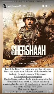 विक्की (Vicky Kaushal) ने अपनी इंस्टा स्टोरी पर इस फिल्म का पोस्टर शेयर करते हुए लिखा, ‘फिल्म बहुत अच्छी लगी. कैप्टन बत्रा के शौर्य और बलिदान को देखकर मेरे आंसू बहने लगे. सभी जवानों को मेरा सलाम. शेरशाह (Shershaah) की पूरी टीम की तारीफ करना चाहूंगा.’ इसके आगे विक्की कौशल (Vicky Kaushal) ने फिल्म के निर्माता-निर्देशक और सिद्धार्थ-कियारा के नाम अपनी पोस्ट में मेंशन किए हैं.