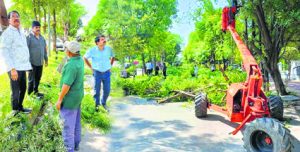 – हाइड्रोलिक गाड़ी पर कर्मचारी सवार होकर करते हैं पेड़ों की छंटाई