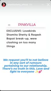 ये ब्रेकअप वाली खबर पढ़कर शमिता शेट्टी (Shamita Shetty) और राकेश बापट (Raqesh Bapat) दोनों ने रिएक्शन दिया है. दोनों ने अपनी इंस्टाग्राम स्टोरीज पर आर्टिकल की तस्वीर पोस्ट करके रिपोर्ट को खारिज कर दिया और कहा, ‘हम आपसे अनुरोध करते हैं कि हमारे रिश्ते से संबंधित किसी भी प्रकार की अफवाहों पर विश्वास न करें. इसमें कोई सच्चाई नहीं है. प्यार और सबके लिए रोशनी.’