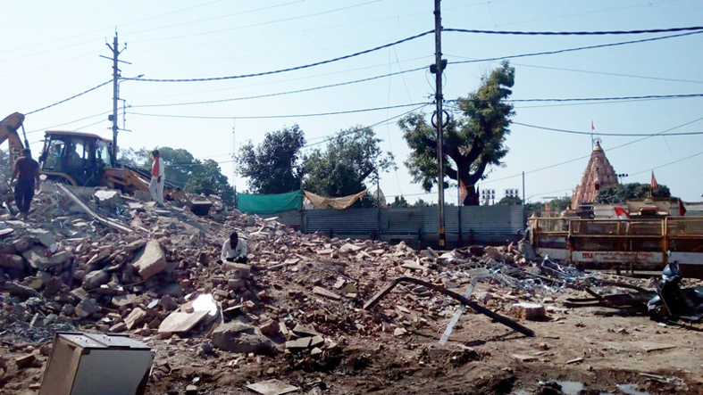 उज्जैन। तीन दिन पहले जिला प्रशासन और नगर निगम ने महाकाल मंदिर के ठीक सामने स्थित 11 मकानों को तोडऩे की कार्रवाई की थी। हालांकि तोड़े गए मकानों का मलबा अभी भी उठा नहीं है। इसके बावजूद यहाँ से अब महाकाल के शिखर दर्शन आसानी से हो रहे हैं। मकानों के टूटने के बाद यह एरिया अब ओपन नजर आने लगा है। जल्द ही यहाँ निर्माण शुरू होंगे और श्रद्धालुओं के लिए कई सुविधाएँ विकसित की जाएंगी। महाकाल विस्तारीकरण योजना के पहले चरण में 700 करोड़ के विकास कार्य किए जा रहे हैं। इसमें महाकाल मंदिर के ठीक सामने 70 मीटर के दायरे में सौ से ज्यादा मकानों को हटाए जाने की योजना है। अभी 3 दिन पहले जिला प्रशासन और नगर निगम ने मंदिर के ठीक सामने के 11 मकानों को हटाने की कार्रवाई की थी। कोर्ट के स्टे के कारण हालांकि एक मकान नहीं तोड़ा जा सका परंतु तोड़े गए 10 मकानों के स्थान से अभी से ही भगवान महाकाल के मंदिर के शिखर दर्शन आसानी से हो रहे हैं।