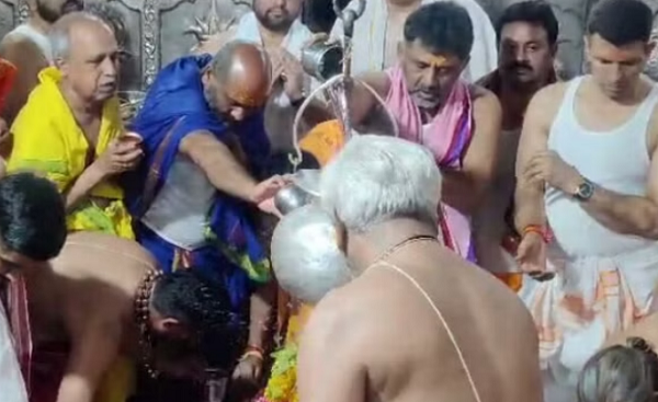 कर्नाटक के उपमुख्यमंत्री डीके शिवकुमार शनिवार को चार्टर्ड प्लेन से दतिया पहुंचे थे। इस दौरान हेलीपैड पर कांग्रेस कार्यकर्ताओं ने उनका स्वागत किया। यहां से वे सीधे पीताम्बरा पीठ पहुंचे और मां पीताम्बरा के दर्शन किए। उन्होंने यहां विशेष पूजा की और महाभारत कालीन वन खंडेश्वर महादेव का जलाभिषेक किया।