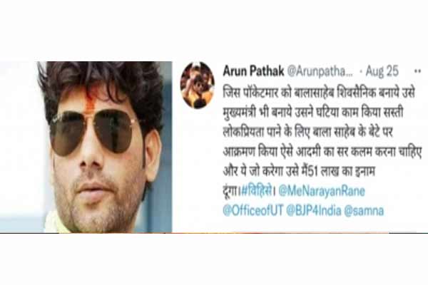 • हिंदू नेता ने नारायण राणे का सिर कलम करने वाले को इनाम देने की घोषणा की