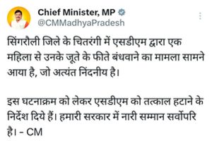 इस वीडियो के वायरल होने के बाद मुख्यमंत्री मोहन यादव ने इसे गंभीरता से लिया है। उन्होंने एक्स पर लिखा, सिंगरौली जिले के चितरंगी में एसडीएम द्वारा एक महिला से जूते के फीते बंधवाने का मामला सामने आया है जो अत्यंत निंदनीय है। इस घटनाक्रम को लेकर एसडीएम को तत्काल हटाने के निर्देश दिए हैं। हमारी सरकार में नारी सम्मान सर्वोपरि है।