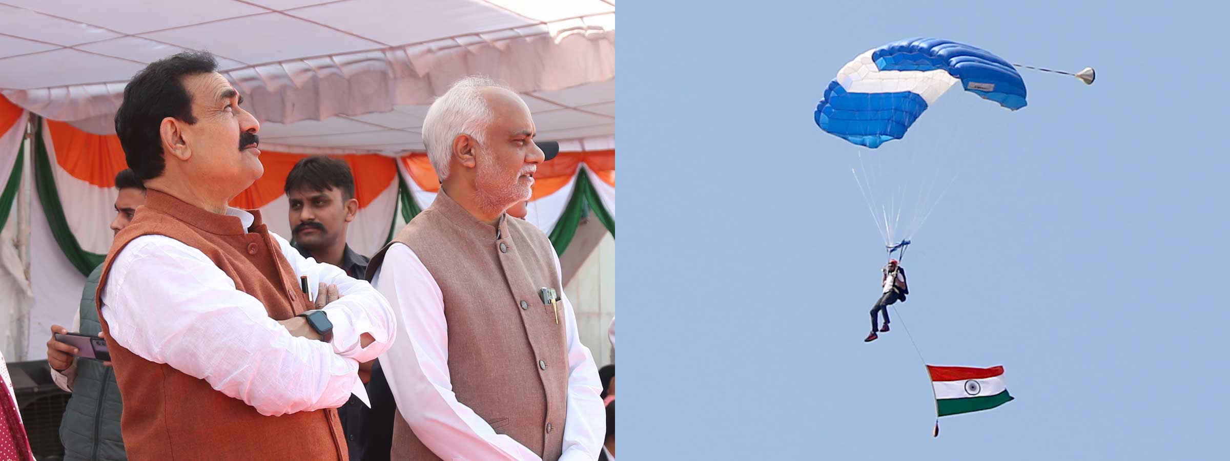 स्काई डाइवर ऐश्वर्य यादव एयरपोर्ट से एयरक्रॉफ्ट उड़ान भरने के बाद जब आरजीपीव्ही के ऊपर पहुँचे, तब गृह मंत्री डॉ. नरोत्तम मिश्रा ने कहा कि “कृपया पधारें, हमे आपका है इंतजार।” श्री यादव ने एयरक्रॉफ्ट से डाइव किया और ग्राउण्ड में उतरे। श्री यादव के बाद स्काई डाइवर श्री रुद्रभानु सोलंकी ने भारत की शान तिरंगे को लहराते हुए डाइविंग की।