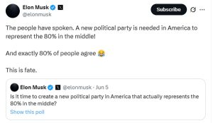 मस्क ने X पर लिखा कि जनता ने अपना फैसला सुना दिया है, अमेरिका में एक नए राजनीतिक दल की जरूरत है, जो बीच के 80% लोगों का प्रतिनिधित्व करे और ठीक 80% लोगों ने इसका समर्थन किया है. यही नियति है. इसके बाद उन्होंने एक और पोस्ट में सिर्फ इतना लिखा ‘The America Party’.