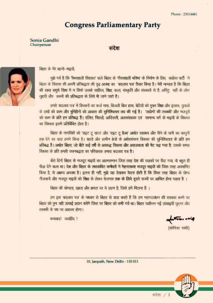 अपने पत्र में सोनिया गांधी ने लिखा है कि ‘वैभवशाली विरासत’ वाले बिहार के ‘गौरवशाली भविष्य’ के निर्माण के लिए कांग्रेस ने राज्य के विकास की अपनी प्रतिबद्धता के तहत ‘बदलाव पत्र’ तैयार किया है। उन्होंने कहा कि बिहार की साख समूचे विश्व में सिर्फ साहित्य, शिक्षा, कला-संस्कृति और संस्कारों से ही नहीं बल्कि खुद्दारी और वचनों की प्रतिबद्धता के लिए भी जानी जाती है। जनभावनाओं का सम्मान करते हुए ही कांग्रेस ने अपने ‘बदलाव पत्र’ यानि घोषणापत्र में किसानों का कर्ज माफ, बिजली बिल हाफ, बेटियों का मुफ्त शिक्षा, इंसाफ, युवाओं को रोजगार और भूमिहीनों को आवास की सुनिश्चितता तय की है। यही नहीं कांग्रेस उद्योगों की तरक्की और मजदूरों को काम के प्रति भी प्रतिबद्ध है। दलित, पिछड़े, आदिवासी, अल्पसंख्यक और सामान्य वर्ग के भाइयों के विकास का विश्वास भी इसमें प्रतिबिंबित है।
