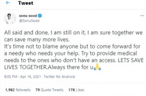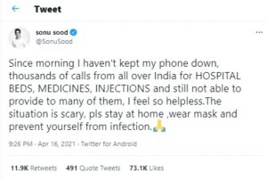 सोनू सूद ने ट्वीट किया कि ‘सुबह से मैं अपना फोन नीचे नहीं रख पाया हूं। पूरे भारत से अस्पताल बेड्स, दवाइयों और इंजेक्शन के लिए हजारों लोगों के फोन। उनमें से बहुतों को यह उपलब्ध कराने में सक्षम नहीं हो रहा। मैं बहुत बेबस महसूस कर रहा हूं। हालात डराने वाले हैं। कृपया घर पर रहिए। मास्क पहनिए और खुद को संक्रमित होने से बचाइए।’