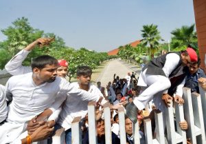 लखनऊ । सपा के राष्ट्रीय अध्यक्ष (SP National President) अखिलेश यादव (Akhilesh Yadav) जेपीएनआइसी का गेट फांदकर (Crossed the Gate of JPNIC) जेपी की मूर्ति पर माल्यार्पण करने (To Garland the Statue of JP) पहुंचे (Arrived) । समाजवादी चिंतक और विचारक जय प्रकाश नारायण की जंयती पर बुधवार को सपा के राष्ट्रीय अध्यक्ष अखिलेश यादव के जेपीएनआइसी जाने से रोकने के लिए एलडीए ने मंगलवार देर शाम गेट पर ताला लगा दिया, लेकिन पुलिस के मना करने पर अखिलेश यादव अपने समर्थकों के साथ गेट फांदकर अंदर पहुंच गए और माल्यार्पण किया।