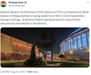प्रह्लाद जोशी ने लिखा कि अमृत काल के बीच संसद में सार्थक चर्चा और बहस का इंतजार कर रहा हूं. बता दें कि संसद का मानसून सत्र 20 जुलाई से 11 अगस्त तक चला था. इस दौरान मणिपुर हिंसा को लेकर दोनों ही सदनों में जमकर हंगामा हुआ था.