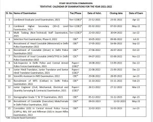 नई दिल्ली । स्टाफ सिलेक्शन कमीशन (staff selection commission) (SSC) ने अगले साल होने वाली भर्ती परीक्षाओं (recruitment examinations) के लिए पूरा शेड्यूल जारी कर दिया है। साल 2022 में किन भर्तियों की परीक्षा कब होगी, इसका कैलेंडर आधिकारिक वेबसाइट ssc.nic.in पर अपलोड कर दिया गया है। उम्मीदवार वेबसाइट पर जाकर MTS, CGL, CHSL, दिल्ली पुलिस (Delhi Police) MTS, SSC GD कांस्टेबल, सेलेक्शन पोस्ट (Constable, Selection Post) समेत तमाम भर्तियों के नोटिफिकेशन जारी किया है।
