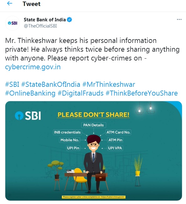 नई दिल्ली । स्टेट बैंक ऑफ़ इंडिया (State Bank of India) ने अपने करोड़ों ग्राहकों को फिर आगाह किया है कि इंटरनेट से बैंक चोरी (Phishing) के मामले लगातार बढ़ रहे हैं और बैंक अकाउंट खाली किए जा रहे हैं. ऐसे में धोखाधड़ी (fraud prevention) से बचे एवं इसके लिए ये आवश्यक तरीके अपनाएं। SBI ने अपने ऑफिशियल ट्विटर हैंडिल पर ट्वीट करके बताया है कि किसी भी SMS, ऐप या मोबाइल नंबर पर अपने पर्सनल डिटेल (your personal details), आधार नंबर Aadhaar number और ई-केवाइसी e-KYC details डिटेल शेयर ना करें.