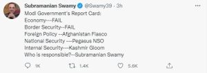 नई दिल्ली। पश्चिम बंगाल की मुख्यमंत्री ममता बनर्जी से मिलने के बाद भाजपा नेता सुब्रमण्यम स्वामी ने केंद्र सरकार पर जोरदार हमला बोला है। उन्होंने आज सुबह अपने ट्विटर अकाउंट पर ट्वीट करते हुए मोदी सरकार का रिपोर्ट कार्ड जारी कर दिया। उन्होंने लिखा कि मोदी सरकार इकोनॉमी, सीमा सुरक्षा, विदेश नीति, राष्ट्रीय सुरक्षा और आंतरिक सुरक्षा जैसे मुद्दे पर फेल रही है। उन्होंने पूछा कि इन विफलताओं की जिम्मेदारी किसकी है।