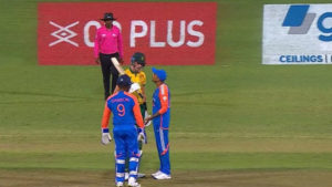 सूर्यकुमार यादव और मार्को यॉन्सन के बीच बहस की घटना दूसरी पारी के 15वें ओवर के दौरान घटी. दरअसल, सूर्यकुमार यादव ने डीप मिडविकेट से थ्रो किया, जिसे संजू सैमसन कलेक्ट करने आए. उन्हें पिच पर आकर बॉल कलेक्ट करता देख यान्सन नाराज हो गए. इसे लेकर उन्होंने शिकायत भी की. हालांकि, उन्होंने खुद भी गेंद पकड़ने में बाधा डाली थी, जिससे सैमसन खुश नहीं थे. सूर्यकुमार यादव ने उन्हें शिकायत करते देखा तो वह तुरंत यॉन्सन के पास जा पहुंचे और दोनों के बीच इस मामले लेकर तीखी बहस होने लगी.
