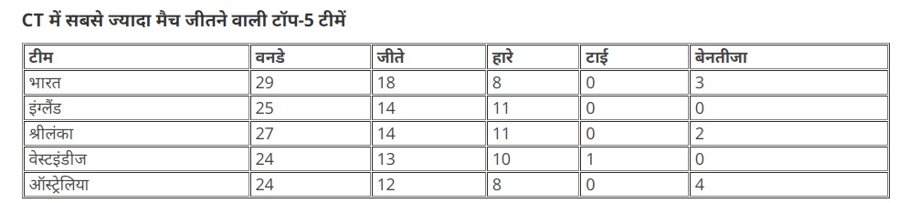 भारतीय टीम अपने शुरुआती दोनों मैचों में बांग्लादेश और पाकिस्तान को हराती है, तो चैम्पियंस ट्रॉफी में वो अपनी 20वीं जीत दर्ज कर लेगी. जो अब तक कोई भी नहीं कर सका है. इस तरह टीम इंडिया चैम्पियंस ट्रॉफी में 20 मैच जीतने वाली पहली टीम बन जाएगी।