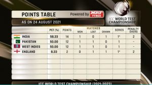 पाकिस्तान क्रिकेट टीम और वेस्टइंडीज दोनों ही टीमें अंक तालिका में दूसरे पायदान पर है। दोनों के 12-12 अंक हैं और 50 का जीत प्रतिशत है। वहीं इंग्लैंड की टीम फिलहाल चौथे स्थान पर है। उसके दो अंक हैं और 8.33 का जीत प्रतिशत है।
