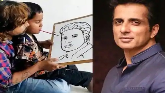• मुंह से पेंट ब्रश पकड़कर दिव्यांग बच्चे ने बनाया सोनू सूद का स्कैच