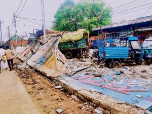 इन्दौर (Indore)। देर रात को फूल मंडी की बाउण्ड्रीवाल (flower market boundary wall) का एक हिस्सा अचानक ढह गया, हालांकि घटना में किसी प्रकार की जनहानी नहीं हुई है। फूल मंडी कि दीवार रात 12 बजे भरभराकर ढह गई। रात होने के चलते वहां कोई मौजूद नही था, जिसके चलते किसी प्रकार की जनहानी नहीं हुई। हालांकि दीवार के पास खड़े तीन वाहनों को जरूर नुकसान हुआ है। बताया जा रहा है कि दीवार पहले से झुकी हुई थी, जो लगातार हो रही बारिश के चलते ढह गई। दिन के समय दीवार के आसपास व्यापारी और किसानों की भीड़ लगी रहती है। अगर हादसा रात के बजाए दिन में होता तो बड़ी जनहानि हो सकती थी। कल ही जूनी इन्दौर में मकान का छज्जा गिरने से एक वृद्ध की मौत हो गई थी।