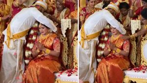 इंटरनेट पर वायरल होने वाले वीडियो में देखा जा सकता है कि स्टेज पर दुल्हन बैठी हुई होती है और इस दौरान दोनों पक्षों का परिवार वहां खड़ा होता है. तभी दूल्हा वहां मंगल सूत्र लेकर पहुंचता है. दुल्हन बेहद ही इमोशनल हो जाती है और हाथ जोड़कर रोने लगती है. दूल्हा पहले अपनी दुल्हनिया को मंगल सूत्र पहनाता है और फिर उसके माथे पर चूमता है.