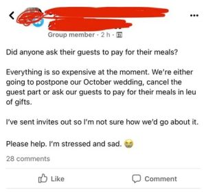 इस पोस्ट में दुल्हन ने लिखा- “क्या कोई शादी में अपने मेहमानों पैसे लेकर उन्हें खाना खिलाता है? आजकल सब कुछ बेहद महंगा हो चुका है. या तो हम अक्टूबर में होने वाली अपनी शादी को आगे के लिए पोस्टपोन कर देंगे, या फिर मेहमानों को बुलाएंगे ही नहीं या फिर अपने मेहमानों से उनके खाने के लिए पैसे लेंगे जो एक तरह से उनका गिफ्ट ही माना जाएगा. मैंने सबको न्योता भेज दिया है तो मुझे नहीं पता कि इस परिस्थिति से कैसे निपटें. प्लीज मेरी मदद करिए, मैं काफी परेशान और दुखी हूं.”