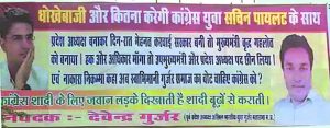कांग्रेस अंचल के गुर्जर वोटरों को लक्ष्य मानकर उपचुनाव में चुनाव-प्रचार के लिए सचिन पायलट को उतारने की रणनीति बना रही है, जिसके कारण शहर में गुर्जर समाज के होर्डिंग्स नजर आने लगे हैं। इन होडिंग्स के माध्यम से संदेश दिया जा रहा है कि सचिन पायलट का अपमान गुर्जर समाज बर्दाश्त नहीं करेगा। समाज ने कांग्रेस से सवाल किया है कि युवा नेता सचिन पायलट के साथ और कितनी धोखेबाजी की जाएगी। भाजपा पहले से एलान कर चुकी है कि सचिन पायलट अंचल में प्रचार के लिए आए तो उन्हें राजस्थान में हुआ अपमान याद दिलाया जाएगा। महल गेट पर अखिल भारतीय युवा गुर्जर महासभा पूर्व प्रदेश अध्यक्ष देवेंद्र गुर्जर के नाम से एक होर्डिंग्स लगाया गया है, जिसमें लिखा गया है कि राजस्थान विधानसभा चुनाव में सचिन पायलट ने रात और दिन मेहनत कर कांग्रेस की सरकार बनवाई, लेकिन पार्टी हाइकमान ने उनसे धोखा कर वयोवृद्ध नेता अशोक गहलोत को मुख्यमंत्री बना दिया। जब सचिन ने अपना अधिकार मांगा तो सचिन पायलट से उनका उप मुख्यमंत्री व प्रदेश अध्यक्ष का पद भी छीन लिया और उनके संबंध अपशब्द बोले। प्रदेश के स्वाभिमान गुर्जर समाज से कांग्रेस कैसे वोट मांग रही हैं। इसी तरह के हालात प्रदेश में ज्योतिरादित्य सिंधिया के साथ भी प्रदेश में बने थे, जिसके कारण सिंधिया ने कांग्रेस छोड़कर भाजपा की सदस्यता ग्रहण कर ली। सचिन पायलट का कांग्रेस उम्मीदवारों के पक्ष में चुनाव प्रचार आने का अधिकारिक कार्यक्रम नहीं बना है, लेकिन विरोध अभी से शुरू हो गया है।