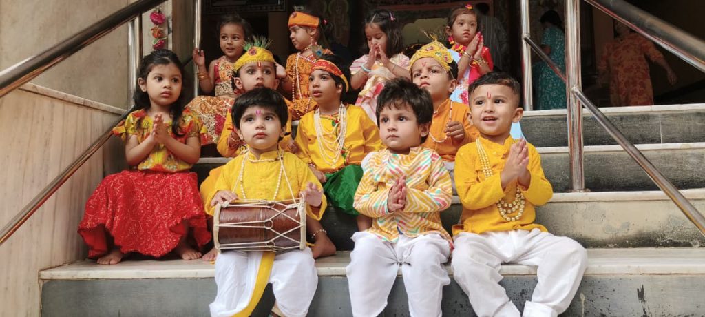शहर के गीता भवन स्थित कृष्ण मंदिर में स्कूल के 30 से अधिक बच्चे कृष्ण भक्ति की धून पर थिरके। इन बच्चों में डेढ़ वर्ष से तीन वर्ष की उम्र के बच्चे शामिल थे। दो वर्ष की आदविका लश्करी ने ढोलक बजाया तो अनव बज ने बांसुरी उठाई और ताली की संगत दी। उसके साथ प्रशीव, प्रव्या, समर्थ, औषधि, विहान, शिवादित्य, तिथिशा, विहाना, आर्या, वान्या, अन्वित, अंजनेय, तेजस, विहाना, वेदांश, आर्येश सहित अनेकों बच्चों ने माखन-मिश्री की लीला दिखाई। बच्चों के उत्साहवर्धन के लिए प्रिंसिपल अनामिका जोशी के साथ सह शिक्षिका यामिनी पॉल, पेगी चौहान, नेहा कांडपाल, रक्षिता झांझरिया, जसमीत अरोड़ा सुरभि कनाडे एवं सहायिका सरिता, आरती, कुसुम और पिंकी भी मौजूद थे।