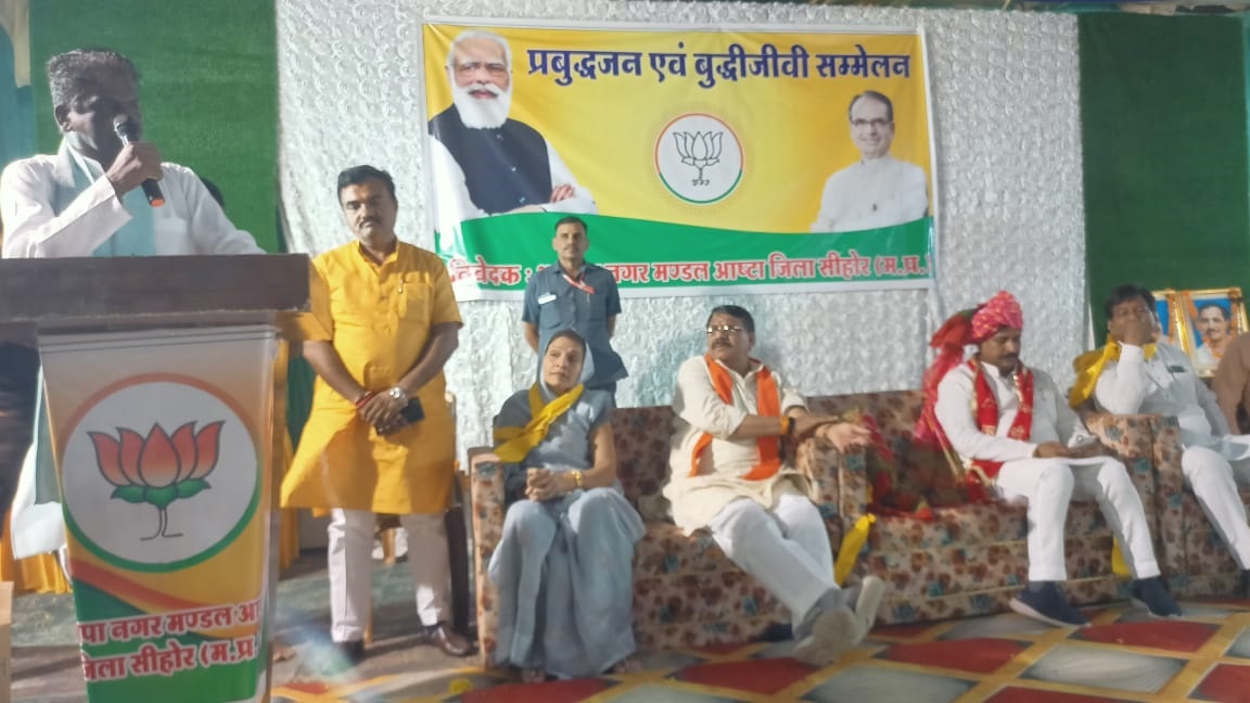 आष्टा। प्रधानमंत्री नरेन्द्र मोदी के जन्मदिन से शुरू हुआ भाजपा का सेवा पखवाड़ा गांधी जयंती पर आयोजित प्रबुद्धजन बुद्धिजीवी सम्मेलन के साथ गीतांजली गार्डन में सम्पन्न हुआ। भाजपा नगर मंडल द्वारा आयोजित सम्मान समारोह में सीहोर जिले के प्रभारी मंत्री डॉ प्रभूराम राम चौधरी मुख्य अतिथि के रूप में उपस्तिथ हुए। कार्यक्रम में विधायक रघुनाथ सिंह मालवीय जिला भाजपा अध्यक्ष रवि मालवीय जिला पंचायत अध्यक्ष इंजीनियर गोपालसिंह नगर पालिका अध्यक्ष हेमकुंवर रायसिंह मेवाडा, जनपद अध्यक्ष प्रतिनिधि सोनू गुणवान,युवा मोर्चे के जिला अध्यक्ष भुपेन्द्र पाटीदार,ओम पटेल विशेष रूप से उपस्थित हुए ।
