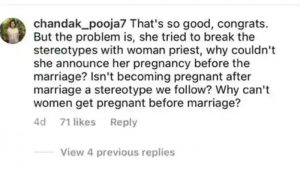 ऐसे में एक यूजर ने दिया से पूछा है कि उन्होंने शादी से पहले इस बात की जानकारी क्यों नहीं दी? वो प्रेग्नेंट हैं इसपर एक्ट्रेस ने इस यूजर को अपना जवाब भी दिया है। एक्ट्रेस ने अपने जवाब में लिखा ” मैं आपको सबसे पहले बता दूं कि हमने इसलिए शादी नहीं की क्योंकि हमें बच्चा होने वाला था। हमने इस इलसिए शादी की है क्योंकि हमें साथ रहना था। हमने साथ जिंदगी बिताने की बात सोची। जब हम अपनी शादी की तैयारी कर रहे थे तब कहीं जाकर हमें पता लगा कि हमारे जीवन में कोई नन्हा मेहमान आने वाला है। ये शादी बच्चे के लिए नहीं की गई ये हमने अपने खुशी के लिए की है।”