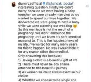 एक्ट्रेस ने अपनी बातों को आगे बढ़ाते हुए लिखा कि ”हम पूरी तरह से सुनिश्चित होने के बाद ही कुछ कहना चाहते थे। ये मेरे जीवन का सबसे खुशनुमा पल है। मैंने अपने जिंदगी में कभी इतना अच्छा फील नहीं किया है। अगर मेडिकल का कारण न हो तो मैं ये बात क्यों किसी से छिपाऊंगी।”