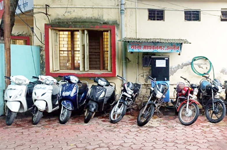 उज्जैन। माधवनगर थाना पुलिस ने वाहन चोरी करने वाले चार बदमाशों को गिरफ्तार कर उनके पास से 14 बाईकें और अन्य वाहन बरामद किए हैं। जब्त वाहनों से पूरा परिसर भरा गया है। आरोपियों में एक कम उम्र का है और सभी नशे का शौक पूरा करने के लिए 5 मिनिट में वाहन चुरा ले जाते थे। इनके दो साथियों की और तलाश है।