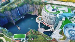 ये अंडरग्राउंड होटल अपनी बनावट के साथ अपने विराट रूप के लिए भी चर्चा में है. मध्य चीन के शेशान पर्वत श्रंखला की एक 90 मीटर बड़ी चट्टान के भीतर ये 5 सितारा होटल बनाया गया है. 88 मीटर गहरे इस होटल का नाम इंटरकॉन्टिनेंटल शंघाई वंडरलैंड (Intercontinental Shanghai Wonderland) और शिमाओ क्वैरी होटल है. इस होटल के सबसे नीचे वाले दो फ्लोर पानी के अंदर हैं.