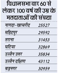 बुजुर्ग मतदाताओं की संख्या उज्जैन दक्षिण विधानसभा में सबसे अधिक 43 हजार 112 वोटरों की है जो कि वोटरों की संख्या में करीब 15 से 20 प्रतिशत के आसपास है। सबसे कम बुजुर्गों की संख्या नागदा-खाचरौद विधानसभा में 25 527 के आसपास है, इसके अलावा 100 प्लस के मतदाताओं की बात की जाए तो सबसे अधिक 128 मतदाता तराना विधानसभा में दर्ज है। नागदा-खाचरौद में सबसे कम मात्र 42 मतदाता 100 प्लस की उम्र के हैं। मतदाता सूची पर यदि गौर किया जाए तो युवाओं की संख्या करीब 50 प्रतिशत से अधिक है और बुजुर्ग मतदाताओं की संख्या यदि 15 प्रतिशत मान ली जाए तो 65 प्रतिशत का एक बड़ा वर्ग युवा और बुजुर्गों का वोटर सूची में दर्ज हुआ है। इसके अलावा 39 से लेकर 60 की उम्र में 35 प्रतिशत मतदाता आते हैं। मतलब साफ है कि युवा और बुजुर्गों को साधना बहुत जरूरी है, क्योंकि बुजुर्गों और युवाओं का प्रतिशत अधिक है।