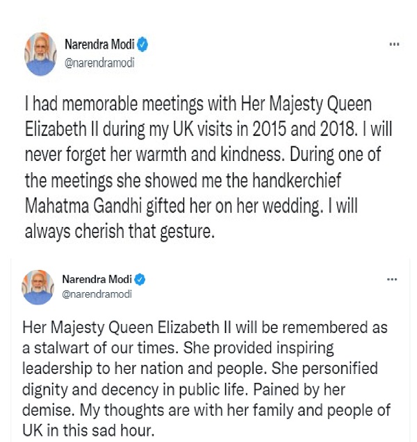 पीएम ने क्वीन के साथ मुलाकात की तस्वीरें साझा करते हुए लिखा- 2015 और 2018 में यूके की अपनी यात्राओं के दौरान मेरी महारानी एलिजाबेथ द्वितीय के साथ यादगार मुलाकातें हुईं. मैं उनकी गर्मजोशी और दयालुता को कभी नहीं भूल पाऊंगा. एक बैठक के दौरान उन्होंने मुझे वह रूमाल दिखाया जो महात्मा गांधी ने उन्हें उनकी शादी में उपहार के तौर पर दिया था.
