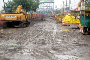 • चारों तरफ हो रही खुदाई और निर्माण के कारण बारिश का पानी जमा हुआ-कीचड़ फैला-फिसल रहे हैं लोग-सुनने वाला कोई नहीं