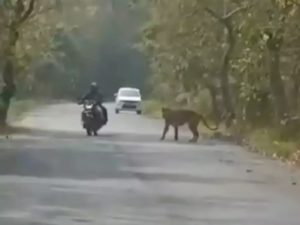 सड़क के दोनों तरफ ट्रैफिक रुका ही था कि अचानक बाइक पर सवार एक पुरुष और महिला तेज रफ्तार में बाघ की ओर बढ़ते नजर आए। अनुमान यही है कि बाइक सवार युवक की नजर बाघ पर नहीं पड़ी और युवक तेज रफ्तार के चलते बाघ की ओर ही बढ़ता चला गया।