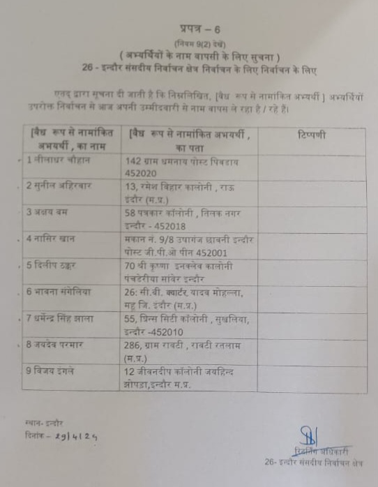 • इंदौर में सियासी हलचल तेज, अक्षय कांति बम समेत 9 प्रत्याशियों ने वापस लिए नाम