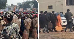अयोध्या: राम मंदिर में प्राण प्रतिष्ठा (Life consecration in Ram temple) के अगल दिन राम भक्तों का सैलाब रामलला के दर्शन (Darshan of Ramlala) के लिए मंदिर पहुंच गया. जानकारी के मुताबिक अब तक कमोबेश 3 लाख लोगों ने राम मंदिर में जा कर दर्शन कर लिया है. इसी बीच भक्तों की बहुत बड़ी संख्या में मंदिर प्रांगण में पहुंचे. श्रद्धालुओं को रोकने के लिए भारी पुलिस फोर्स तैनात (Heavy police force deployed) की गई लेकिन बेकाबू भीड़ सुरक्षा बैरीगेड़ तोड़ कर मंदिर में पहुंच गए. इसी के बीच अचानक से उत्तर प्रदेश के मुख्यमंत्री योगी आदित्यनाथ अयोध्या पहुंचे हैं. उनका यह दौरा पहले से तय नहीं था.