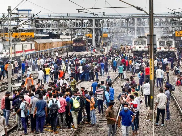 दिल्ली अग्निवीर प्रदर्शन (agniveer performance) के दौरान भारतीय रेल (Indian Rail) पर सबसे ज्यादा असर पड़ा है। जहां देश के अलग-अलग हिस्सों में ट्रेनों में आग (fire in trains) लगा दी गई। इन घटनाओं के चलते तमाम ट्रेनों को कैंसल कर दिया गया। वहीं कुछ के रूट बदल दिए गए। केवल बिहार में 13 ट्रेनों के 60 से अधिक कोच फूंक दिए गए। उत्तर प्रदेश, हरियाणा और पश्चिम बंगाल में भी ट्रेनों के परिचालन पर असर पड़ा है। पूरे दिन में देशभर की कुल 340 ट्रेनों पर असर ( total of 340 trains across the country have been affected.) पड़ा है। इसके चलते रेल पैसेंजर्स को काफी परेशानी उठानी पड़ी।
