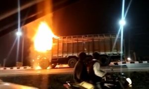 इंदौर बाईपास स्थित फीनिक्स मॉल के सामने चलते ट्रक में लगी आग, लगा लम्बा जाम