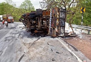 ब्रेक फेल होते ही एक ट्रक के ड्राइवर क्लीनर ने कूदकर जान बचाई… दूसरे ट्रक के क्लीनर की जलकर मौत