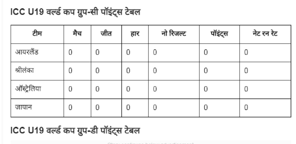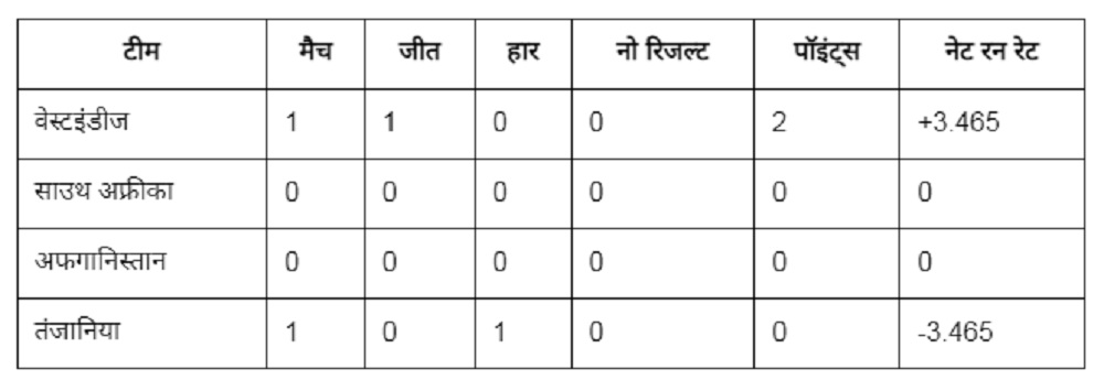 नई दिल्ली। आयुष म्हात्रे (Ayush Mhatre) की अगुवाई वाली भारतीय अंडर-19 टीम (Indian Under-19 team) ने U19 वर्ल्ड कप 2026 (U19 World Cup 2026) अभियान का आगाज जीत के साथ किया। टीम इंडिया ने बारिश से बाधित अपने पहले मुकाबले में यूएसए को 6 विकेट से धूल चटाई। भारत ने पहले बॉलिंग करते हुए यूएसए को 107 रनों पर ढेर कर दिया था। बारिश की वजह से ओवर में कटौती हुई। भारत को 37 ओवर में DLS मेथन की वजह से 96 रनों का टारगेट मिला। इस स्कोर को टीम इंडिया ने 17.2 ओवर में 6 विकेट रहते हासिल कर जीत दर्ज की। भारत के अलावा वेस्टइंडीज, स्कॉटलैंड और जिम्बाब्वे की टीमें भी पॉइंट्स टेबल में खाता खोलने में कामयाब रहीं। वेस्टइंडीज अंडर-19 टीम ने तंजानिया को हराया तो, जिम्बाब्वे और स्कॉटलैंड का मैच बारिश की भेंट चढ़ा। आईए एक नजर U19 वर्ल्ड कप पॉइंट्स टेबल पर डालते हैं-