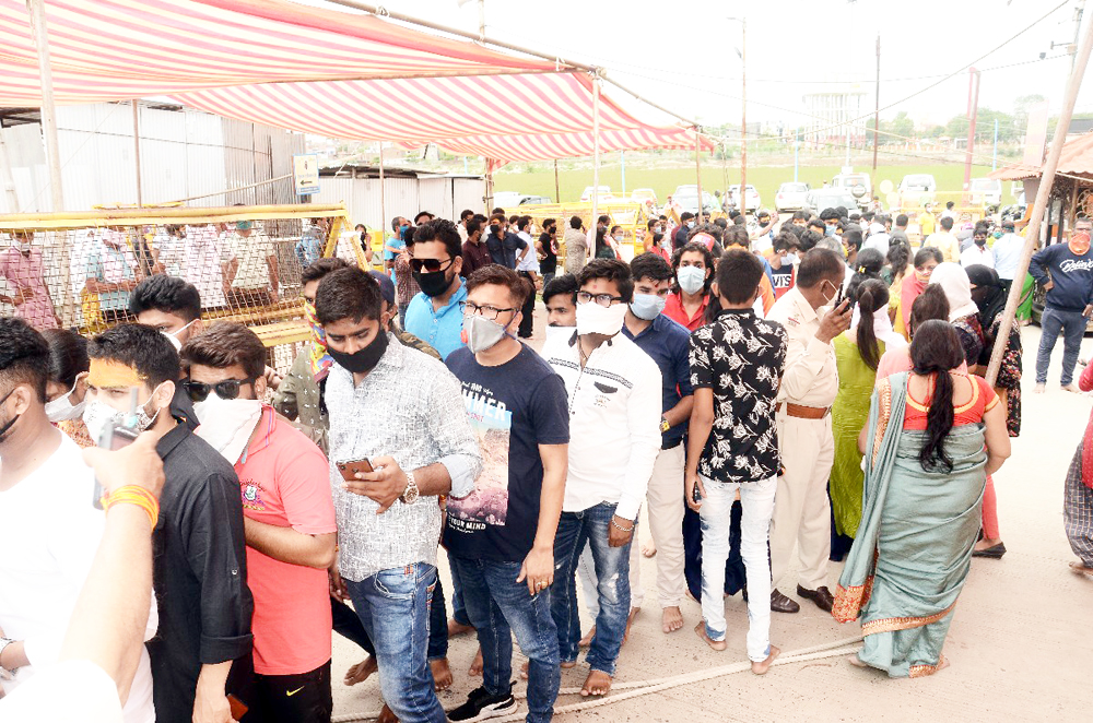 उज्जैन। विश्व प्रसिद्ध महाकाल मंदिर में दर्शन शुरू हो गए हैं और प्रतिदिन सावन में हजारों लोग आ रहे हैं लेकिन सभी एक दूसरे से चिपक कर खड़े हो रहे हैं और फोटों में साफ दिख रहा है कि किस तरह सोशल डिस्टेंसिंग की धज्जियाँ उड़ रही हैं एवं कोई सावधानी नहीं बरती जा रही है, जबकि मंदिर में बड़ी संख्या में सुरक्षाकर्मी एवं अन्य कर्मचारी हैं। जब दुकान के बाहर सामान लेने के लिए हर दो फीट की दूरी पर गोल घेरे बनाए गए हैं तो मंदिर की कतार में खड़े श्रद्धालु एक दूसरे से सटकर क्यों दर्शन कर रहे हैं और इन्हें रोकने वाला भी कोई नहीं। ऐसे में यह लापरवाही भारी पड़ सकती है। उल्लेखनीय है कि महाकाल दर्शन करने बाहर से भी बड़ी संख्या में लोग आ रहे हैं।
