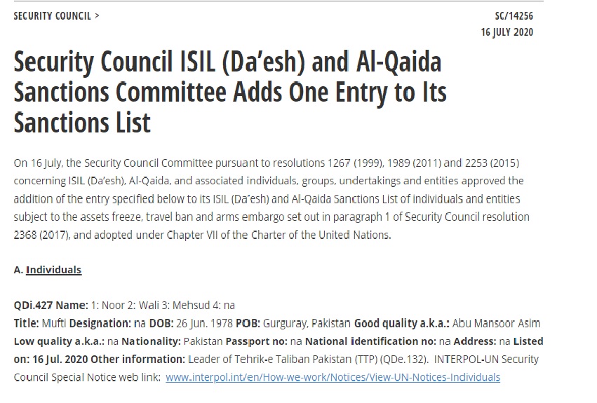 संयुक्त राष्ट्र । संयुक्त राष्ट्र सुरक्षा परिषद समिति (UNSC) ने तहरीक-ए-तालिबान पाकिस्तान (टीटीपी) के नेता नूर वली महसूद पर प्रतिबंध लगा दिया है। उसने इस आतंकी का नाम प्रतिबंधित लोगों और संस्थाओं की सूची में डालने को मंजूरी दे दी है। जिसके बाद महसूद की संपत्ति फ्रीज करने के साथ ही उस पर यात्रा और हथियारों के प्रतिबंध लग गए हैं।