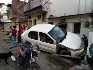 इंदौर। विकास नगर (VIkas Nagar) अमर टेकरी के पास आज सुबह एक बड़ा हादसा होते-होते बचा, जब एक कार (Car) सडक़ किनारे स्थित मकान में जा घुसी। हालांकि दीवार से टकराने के बाद वह बंद हो गई। मिली जानकारी के अनुसार घटना सुबह 6 बजे की है। इंडिगो सीएस (Indigo CS) कार का संतुलन बिगड़ गया और चालक ने सडक़ किनारे खड़ी तीन बाइक को चपेट में ले लिया। कार सडक़ किनारे रहने वाले मनोज सिरसिया के मकान में जा घुसी। हालांकि घटना के वक्त मनोज का परिवार सोया हुआ था, जो धमाके की आवाज सुनकर जाग गया। हालांकि गाड़ी से किसी प्रकार की जनहानि नहीं हुई। यदि गाड़ी घर में घुस जाती तो बड़ा हादसा संभव था। एमआईजी पुलिस ने गाड़ी जब्त कर ली। चालक की तलाश जारी है।
