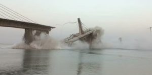 भागलपुर। बिहार के भागलपुर (Bhagalpur of Bihar) में सुलतानगंज-अगुवानी गंगा नदी (Sultanganj-Aguwani Ganges River) पर बन रहे निर्माणाधीन फोरलेन पुल (four lane bridge under construction) एक बार फिर जमींदोज हो गया। निर्माणाधीन पुल का सुपर स्ट्रक्चर नदी (super structure river) में गिर गया। अगुवानी के तरफ से पुल के पाया नंबर 10,11,12 के ऊपर का पूरा सुपर स्ट्रक्चर गिर गया है जो लगभग 100 मीटर का हिस्सा होगा। हालांकि, पुल के स्ट्रक्चर गिरने का कारण अभी स्पस्ट नहीं हो पाया है।