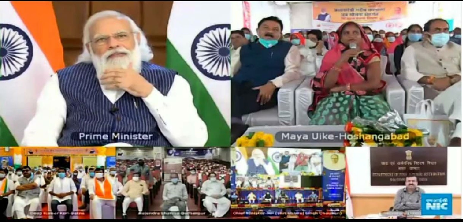 प्रधानमंत्री श्री मोदी मध्यप्रदेश में प्रधानमंत्री गरीब कल्याण अन्न योजना में आयोजित नि:शुल्क राशन वितरण कार्यक्रम को मुख्य अतिथि के रूप में वर्चुअली संबोधित कर रहे थे। प्रधानमंत्री श्री मोदी ने योजना के हितग्राही सतना के दिलीप कुमार कोरी, निवाड़ी के चंद्र बदन विश्वकर्मा, होशंगाबाद की माया धुर्वे और बुरहानपुर के राजेंद्र शर्मा से वर्चुअली संवाद भी किया।