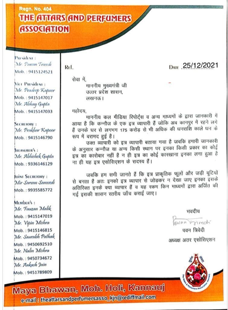 जीएसटी इंटेलिजेंस की ओर से की गई छापेमारी के दिन से ही पीयूष जैन के इत्र कारोबारी होने के दावे सामने आ रहे थे. पीयूष की समाजवादी पार्टी (सपा) से नजदीकी की बातें भी सामने आ रही थीं. इन सबके बीच अब इस मामले में नया मोड़ आ गया है. इत्र और परफ्यूमर्स एसोसिएशन ने पीयूष को लेकर दावा किया है कि वह इत्र कारोबार से नहीं जुड़ा है.