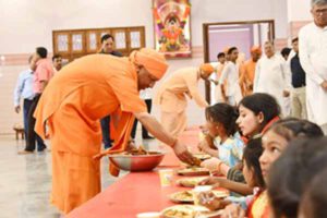 पूजन के बाद इन कन्याओं को मंदिर की रसोई में पकाया गया ताजा भोजन प्रसाद सीएम योगी ने अपने हाथों से परोसा। कन्याओं के अतिरिक्त बड़ी संख्या में पहुंचे बटुकों को भी श्रद्धापूर्वक भोजन कराकर उपहार और दक्षिणा दिया गया। यूपी के मुख्यमंत्री एवं गोरक्षपीठाधीश्वर योगी आदित्यनाथ ने बुधवार दोपहर श्रीरामनवमी के महापर्व पर विधि-विधान से भगवान श्रीराम का जन्मोत्सव मनाया। इस अवसर पर मंदिर परिसर प्रभु श्रीराम के भजनों से गुंजायमान रहा।